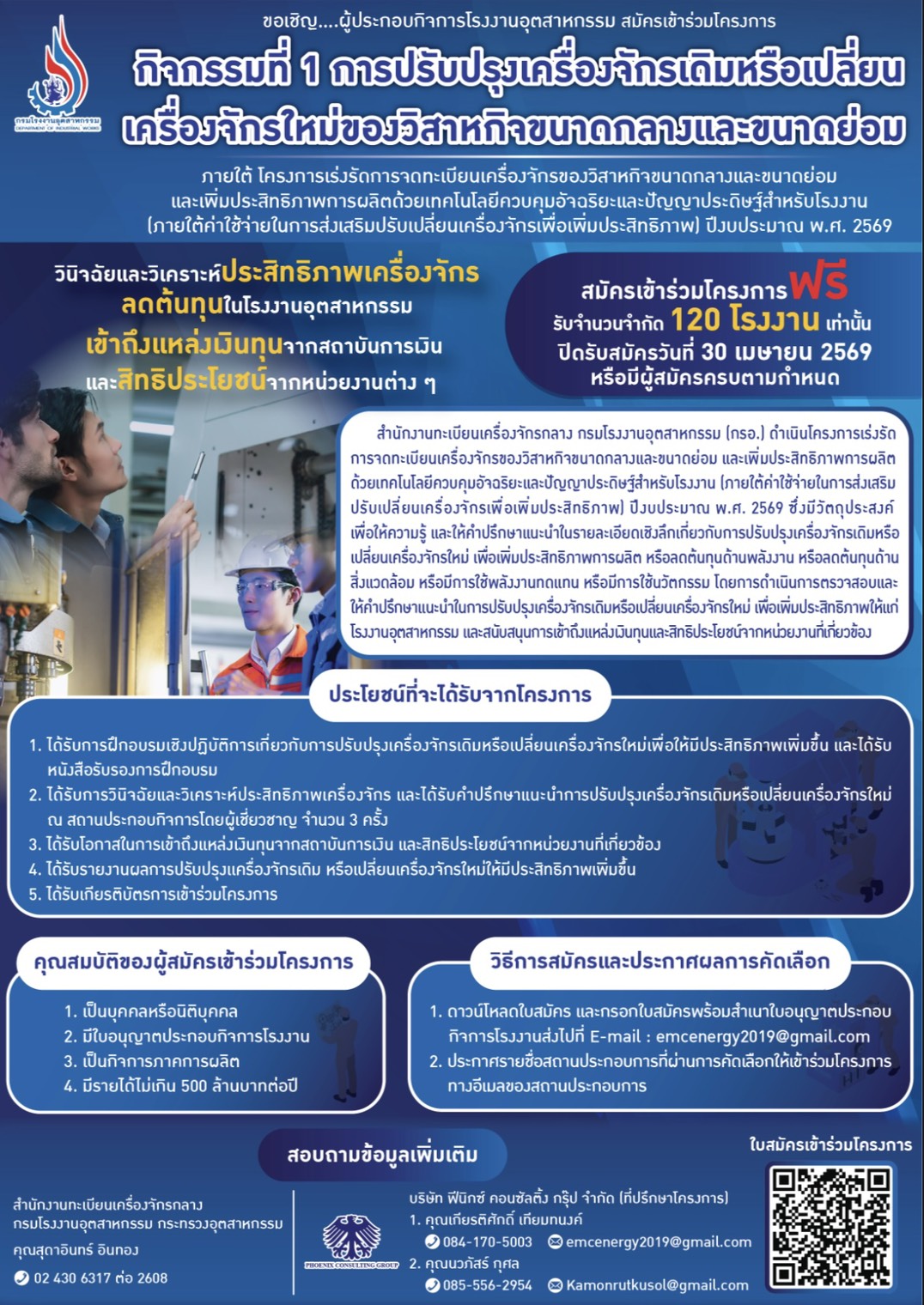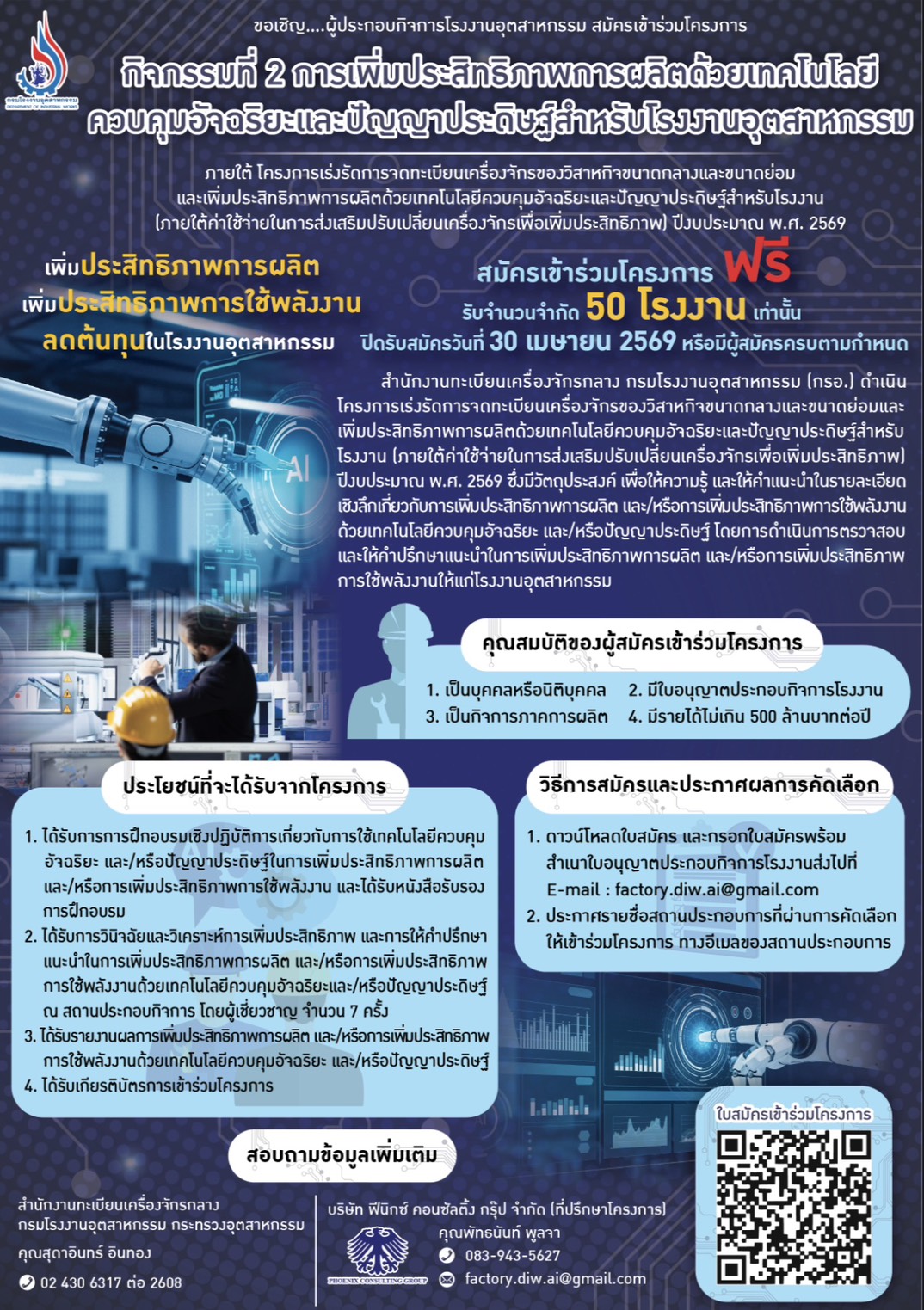 ขอเชิญผู้ประกอบการสมัครเข้าร่วมโครงการเร่งรัดการจดทะเบียนเครื่องจักรของวิสาหกิจขนาดกลางและขนาดย่อม และเพิ่มประสิทธิภาพการผลิตด้วยเทคโนโลยีควบคุมอัจฉริยะ และปัญญาประดิษฐ์สำหรับโรงงาน (ภายใต้ค่าใช้จ่ายในการส่งเสริมปรับเปลี่ยนเครื่องจักรเพื่อเพิ่มประสิทธิภาพ) ปีงบประมาณ พ.ศ. 2569