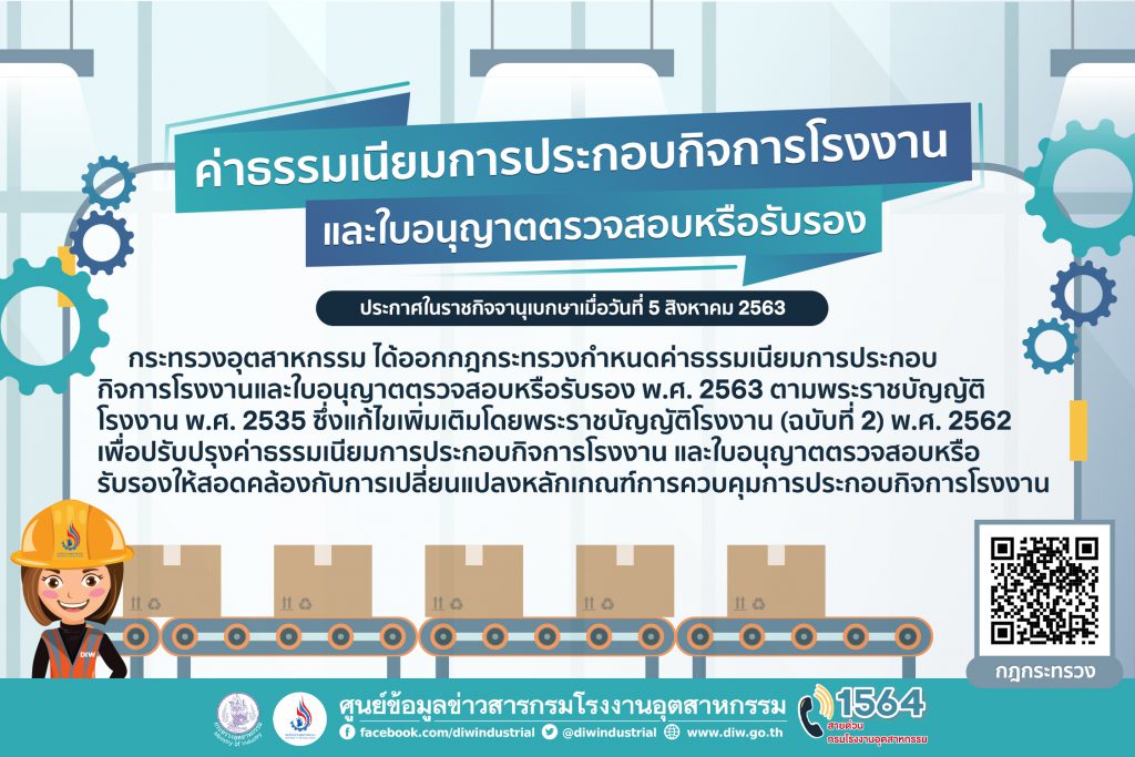 กระทรวงอุตสาหกรรมได้ออกกฎกระทรวงกำหนดค่าธรรมเนียมการประกอบกิจการโรงงานและใบอุนญาตตรวจสอบหรือรับรอง พ.ศ.2563 ตามพระราชบัญญัติโรงงาน พ.ศ.2535 ซึ่งแก้ไขเพิ่มเติมโดยพระราชบัญญัติโรงงาน (ฉบับที่ 2) พ.ศ.2562 เพื่อปรับปรุงค่าธรรมเนียมการปประกอบกิจการโรงงาน และใบอนุญาตตรวจสอบหรือรับรองให้สอดคล้องกับการเปลี่ยนแปลงหลักเกณฑ์การควบคุมการประกอบกิจการโรงงาน